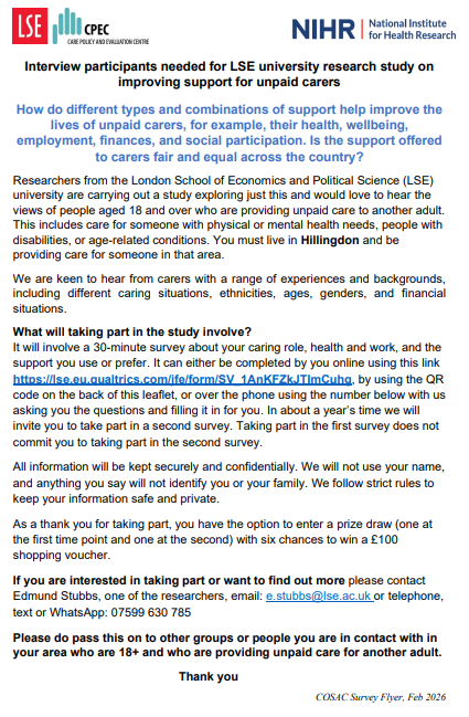 Carers’ Forum Join us On Wednesday 25th March 10am to 2pm Have your say on local health and wellbeing services Lunch will be provided Click to participate Are you a carer aged 18 or over caring for another adult?Interview participants needed for LSE university research study on improving support for unpaid carers.To take part, click the button or scan the QR code below